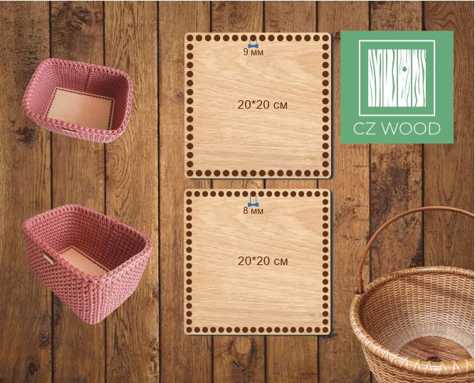 Dřevěné dno z překližky - čtverec 20x20 cm s otvory o průměru 8 nebo 9 mm Je vhodné pro výrobu háčkovaných košíků ze špagátových a šňůrkových přízí.
